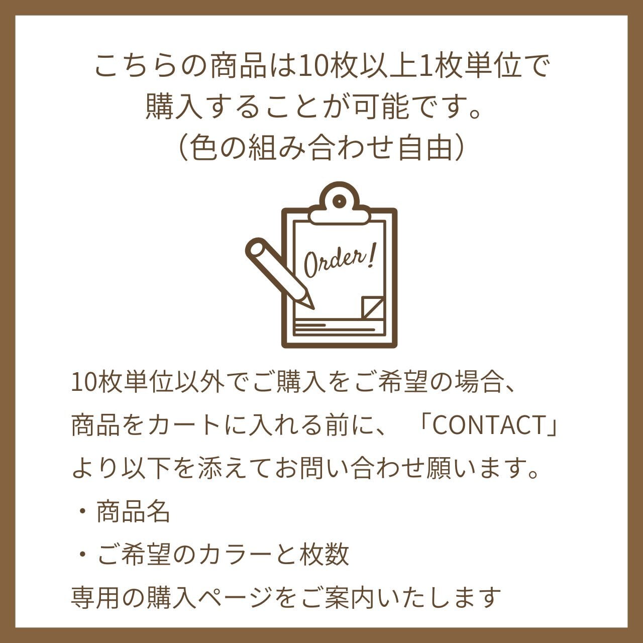 本商品はシステム上「10枚セット」での販売となっておりますが、実際にはお好きなカラーを組み合わせて、合計10枚以上1枚単位でのご注文が可能です。